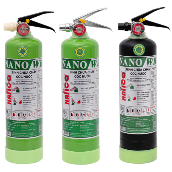 - Bình chữa cháy gốc nước hay còn gọi là sương nước NANO/WB với thành phần chính của nó bao gồm chất hoạt động bề mặt, chất làm đặc, chất ổn định, chất phụ gia và nước tinh khiết RO. Nó có khả năng phân hủy sinh học 100% sau khi chữa cháy và không gây hại cho môi trường.