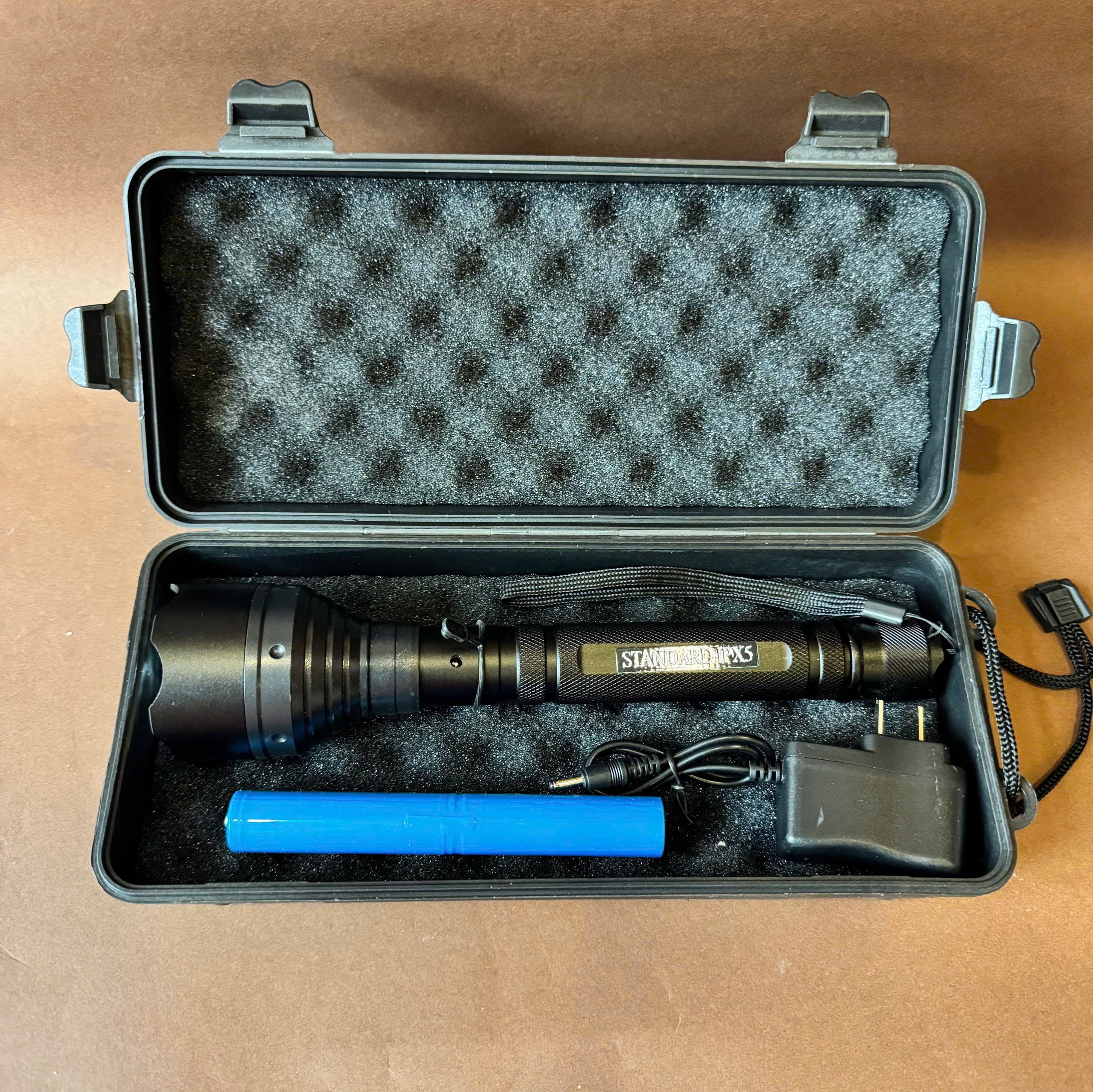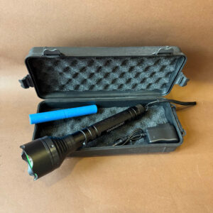 Một hộp đựng bao gồm: đèn, pin sạc, củ sạc, hộp nhựa chống sốc.